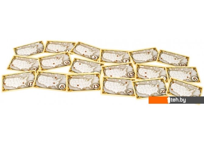 | Комплектация | 1 карта Северной Америки (поле) 240 вагончиков 5 маркеров подсчёта очков 110 карт составов 30 карт маршрутов 5 памяток 1 карта-бонус Правила игры |