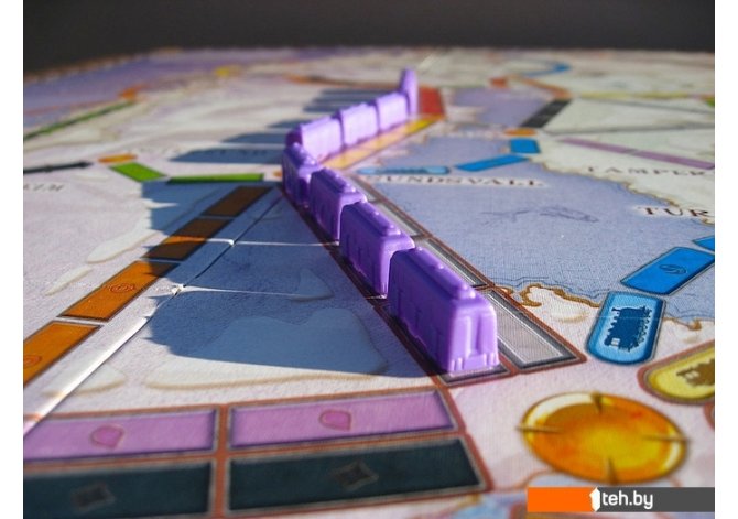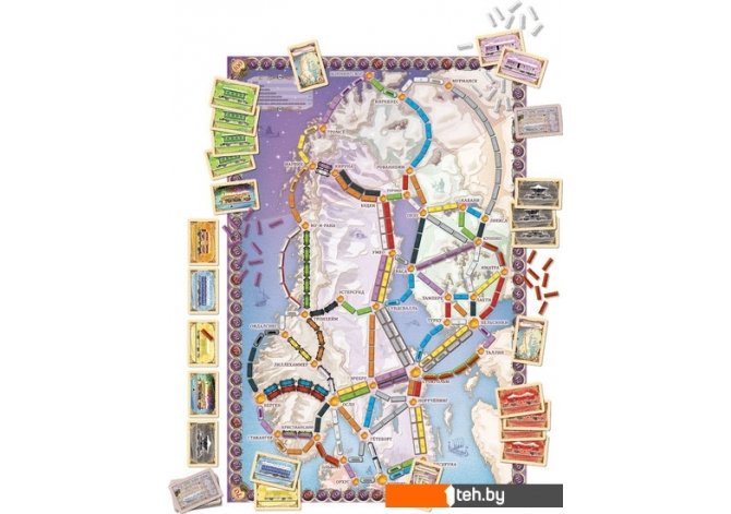 | Комплектация | Игровое поле (карта Северной Европы)120 вагончиков110 карт составов46 карт маршрутов1 карта «Путешественник»3 маркера подсчёта очковПравила игры |