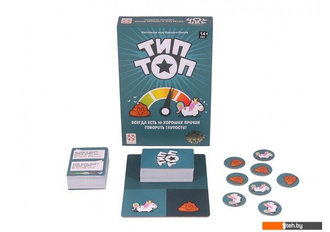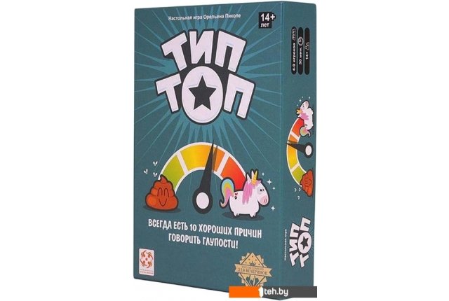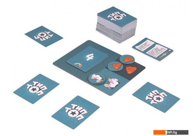 | Информация | Вы со своими друзьями на одной волне? Проверьте это на деле! Тип-Топ - это кооперативная игра (все участники играют в одной команде). В каждом раунде капитан берёт верхнюю карту с темами, выбирает одну из них и зачитывает ее вслух. Задача игроков - дать ответ, соответствующий номеру на карте (от 1 до 10). Но всё не так просто! Капитан должен расположить ответы в порядке возрастания. Тут нужно подумать! Сложная задача, не так ли? Теперь проверьте свои способности! |