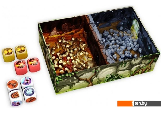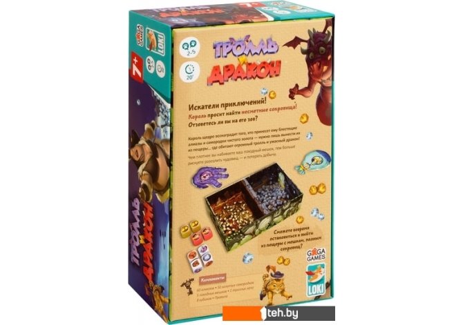 | Комплектация | - 8 кубиков- 110 сокровищ- 5 походных мешков- Троллья лапа- Пещера сокровищ- Правила игры |