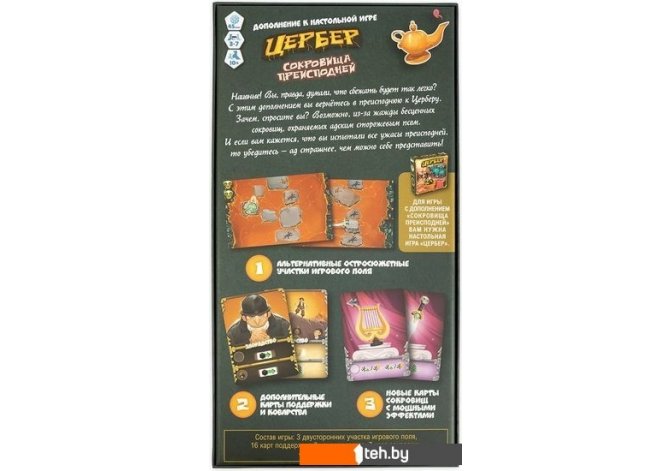 | Информация | Вырваться из лап Цербера не просто, вы можете применить разные тактики: действуйте в интересах группы или убегайте в одиночку, старайтесь создать временные союзы или рассорить команду героев. «Цербер. Сокровища преисподней» — дополнение к игре «Цербер». Для игры вам потребуется базовая коробка. В этом дополнении вы найдете всё необходимое, чтобы настроить игру под ваше настроение и манеру. Новые карты поддержки и коварства используются по обычным правилам игры, их можно использовать отдельно от других дополнений. Добавьте в игру немного упорства, дерзости, желания найти крайнего, и конечно, капельку злорадства. Новые участки игрового поля увеличивают разнообразие вариантов пути из преисподней. Участки различаются степенью сложности, а также игровыми правилами. Вам встретится «Дьявольский уклон», «Гнездо гарпий», «Врата смерти», «Омут Сирены» и другие потрясающе тёмные места, из которых хочется побыстрее сбежать (если вы не Цербер, конечно). Они могут быть использованы отдельно от других дополнений (за исключением участка с Пещерой чудес). Карты сокровищ — это новый элемент в игровой механике. Они имеют цену и обладают мощными эффектами. Разыграв такую карту, передайте её следующему участнику. То есть такие карты всегда остаются в игре, пока Цербер не настигнет их обладателей. Комплектация: 16 карт поддержки. 6 карт коварства. 3 двусторонних участка игрового поля. 7 карт сокровищ. 3 жетона гарпий. 1 жетон Логова Цербера. Размер карт: 63х88 мм. Размер коробки: 140х264х45 мм. |