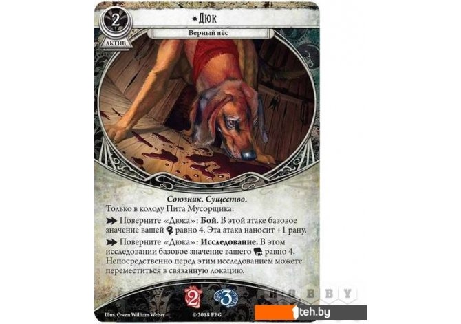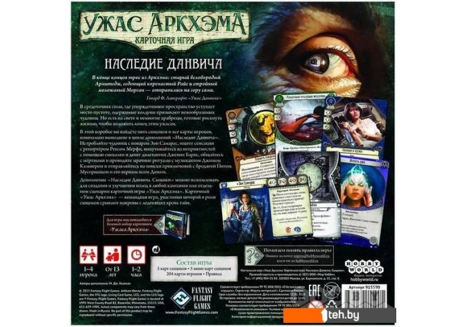 | Информация | Обзор В конце концов трое из Аркхэма: старый белобородый Армитедж, седеющий коренастый Райс и стройный моложавый Морган – отправились на гору сами. Говард Ф. Лавкрафт «Ужас Данвича». В средоточиях силы, где упорядоченное пространство уступает место пустоте, одержимые колдуны призывают невообразимых чудовищ. Но есть на свете и немногие храбрецы, готовые рискнуть жизнью, чтобы положить конец этим ужасам. В этой коробке вы найдете пять сыщиков и все карты игроков, изначально вышедшие в цикле дополнений «Наследие Данвича». Истребляйте чудовищ с поваром Зои Самарас, ищите сенсации с репортером Рексом Мерфи, выпутывайтесь из неприятностей с помощью смекалки и денег дилетантки Дженни Барнс, общайтесь с мертвыми и проводите мрачные ритуалы с музыкантом Джимом Кальвером и отправляйтесь на поиски приключений с бродягой Питом Мусорщиком и его верным псом Дюком. Дополнение «Наследие Данвича. Сыщики» можно использовать для создания и улучшения колод в любой кампании или отдельном сценарии карточной игры «Ужас Аркхэма». Карточный «Ужас Аркхэма» — командная игра, участники которой в роли сыщиков срывают покровы с леденящих кровь тайн. Включает все карты игроков из оригинального цикла дополнений «Наследие Данвича». Обратите внимание! Это дополнение. Для игры вам понадобится базовый набор карточного «Ужаса Аркхэма». Комплектация: 5 карт сыщиков. 5 мини-карт сыщиков. 204 карты игроков. Размер карт: 63?89 мм (209 шт). Размер карт: 41?63 мм (5 шт). |