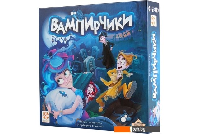 | Информация | Вечеринка вампиров в самом разгаре. Вот только за шумным весельем никто не заметил, что до рассвета осталось всего ничего. Скорее! До того, как первые лучи солнца коснуться земли, вам нужно всем спрятаться на кладбище. Главное – не наткнуться на чеснок или того хуже – осиновый кол. Бррр!!!Вампирчики – это настольная игра для всей семьи на внимательность и зрительную память. Кряхтя от тяжести картона, поднимайте надгробные плиты и ищите свободные могилы, чтобы спрятать своих вампирчиков быстрее других. Подкладывайте чеснок, чтобы напакостить противникам. Старайтесь не стучаться в уже занятые могилы, иначе вам придётся размещать ещё и вампирчиков других игроков. |