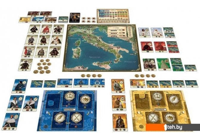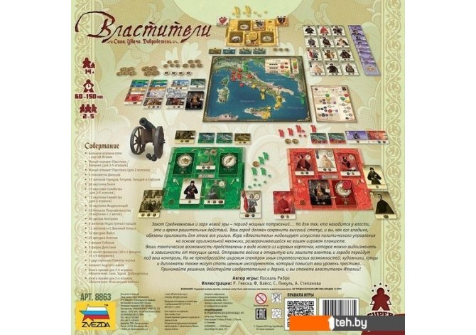 | Информация | Развивайте экономику и сражайтесь за города Италии! Есть два способа борьбы: один — использовать закон, второй — применить грубую силу. Первый способ присущ человеку, второй свойственен зверю. Но, поскольку зачастую первого недостаточно, приходится прибегнуть и ко второму. Никколо Макиавелли, «Государь» (1532 год) В этой игре вы представитель одной из великих династий, оставивших след в итальянской истории и культуре эпохи Возрождения: неаполитанских Арагонов, миланских Сфорца, флорентийских Медичи, венецианских дожей или римских Борджиа. Вы будете управлять ресурсами, поддерживать науку и искусство, торговать, захватывать города, а также заключать союзы с великими иностранными державами того времени. Какой способ борьбы за власть по нраву именно вам?! Эта настолка создана для вас, если вы: Любитель сложных игр с активным взаимодействием участников, ведь в ней очень много возможностей для прямого конфликта. Тактик, потому что в игре пять разных династий, каждый из которых имеет как сильные, так и слабые стороны. Евростратег, так как во время партии придётся грамотно планировать свои действия и эффективно тратить ограниченные ресурсы. Эстет, ведь у игры восхитительное оформление: уникальные иллюстрации, высококачественные деревянные фишки, толстые картонные жетоны и «льняные» буклеты правил. «Властители» — это игра, в которой вы будете утверждать свою власть и превосходство любой ценой! Торговля и интриги, альянсы и предательства, шпионы и союзники — используйте все возможности ради достижения этой высокой цели. Обойдите другие династии и станьте истинным властителем Италии! Комплектация: Игровое поле с картой Италии. 7 планшетов. 77 жетонов. 103 карточки. 90 дисков контроля. 57 фигурок. 10 фишек. 45 монет-флоринов. 5 двусторонних памяток. Блокнот подсчета очков. Книга правил для 3-5 игроков. Книга правил для 2 игроков. |