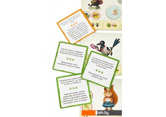 | Комплектация | 1. 5 фигурок животных с подставками 2. 4 планшета героев 3. 4 части игрового поля 4. 30 жетонов леса трёх видов 5. 30 карточек заданий 6. Правила игры |