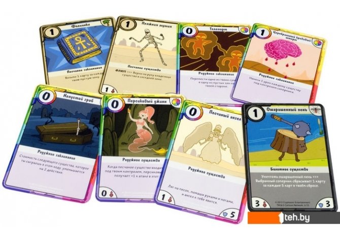 | Информация | Самая эпичная настольная игра, какую можно найти в землях Ууу... да и не только там! Настольное сражение развернётся на песчаных землях и бесполезных болотах. Натрави песчаных акул на болотных русалок, столкни на поле боя пляжную мумию и ундинку-блондинку, а потом флюпни Доктора Смерть, чтоб сопернику было неповадно!«Бимо против Леди Ливнерог» — самостоятельная игра, но можешь смешать её с набором «Финн против Джейка». Собери собственную колоду, сразись с другом и выясни, кто из вас круче. |