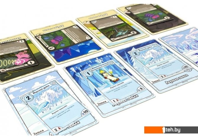 | Комплектация | 2 колоды по 40 карт в каждой 4 жетона мороза 2 планшета героев 8 планшетов земель Жетоны урона Правила игры |