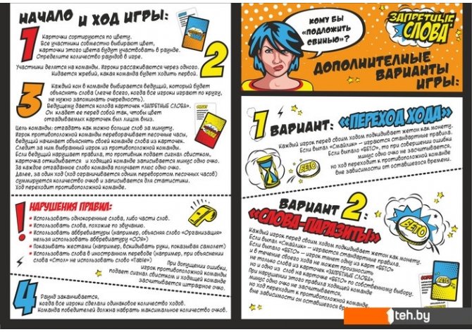 | Информация | Запретные слова - игра в слова для компании.Цель игры: объяснить участникам своей команды как можно больше слов с карточек, не используя запретных слов. В состав игры входят карточки со словами.В заголовке написано слово, которое нужно объяснить, а ниже слова, которые нельзя употреблять при объяснении. В игре соревнуются команды. Для каждого раунда выбирается ведущий, который будет объяснять слова своей команде. Ведущий берет по 1 карточке из колоды со словами и объясняет слова с них своей команде, если команда отгадала слово, ведущий берет следующую карточку ... Время раунда - 1 мин. Из команды соперника выбирается 1 игрок, который будет следить за соблюдением правил. Если объясняющий игрок нарушил правила (произнес запретное слово, однокоренное слово, использовал жесты), противник подает сигнал свистком (входит в комплект) и карточка откладывается.В конце раунда подсчитывается число набранных очков, за каждое отгаданное слово +1 балл, за каждое нарушение -1 балл. Выигрывает команда, которая в коне игры наберет наибольшее количество очков.Авторы предлагают и дополнительные варианты игры. Игра с использованием дополнительных запретных слов со специальных карточек Табу. Игра наоборот, в которой нужно угадать слово по соответствующим ему запретным словам.Игра Запретные слова отлично подходит как для взрослых, так и для детских компаний (от 10 лет). Можно играть на семейных праздниках и корпоративных. В походах и ресторанах. |