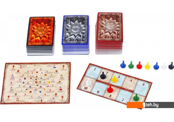 | Комплектация | - Практикум (76 карт, фишки игроков, счетчик очков, правила)- Университетский курс (63 карты, правила)- Гильдия Алхимиков (54 карты, правила, 9 карт Последовательности)- карта "Алхимикотэ" |