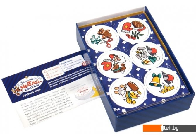 | Информация | «Читай-хватай» учит не только складывать из букв слова, но и мгновенно считывать, распознавать слово целиком, как бы «фотографируя» его. Игроки наперегонки стараются как можно быстрее сопоставить слово с картинкой. В такой азартной обстановке дети, сами того не замечая, постепенно начинают читать всё быстрее и быстрее. Поверьте, через некоторое время они и вам дадут фору!4+ лет: обучение чтению8+ лет: развитие скорочтения |
