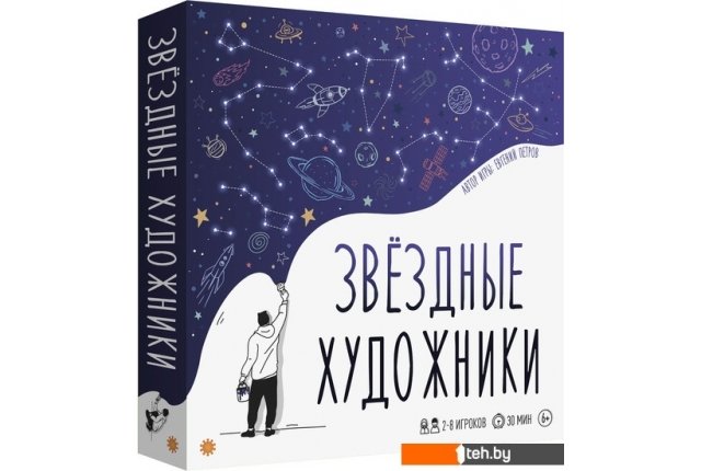 | Информация | Звёздные Художники – настольная игра от издательства Экономикус про рисование созвездий из абстрактных фигур на звёздной карте. Игроки сообща вместе рисуют загаданное созвездие так, чтобы его смог отгадать ведущий. Но у каждого свои инструменты рисования – кто-то рисует только круг, а кто-то треугольник. На что же будет похоже ваше созвездие? |