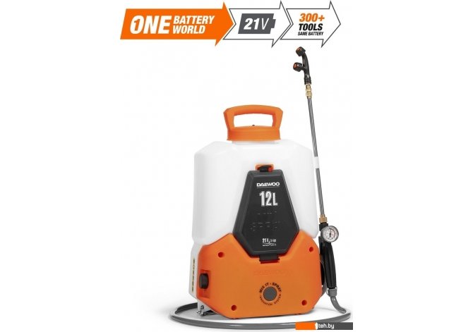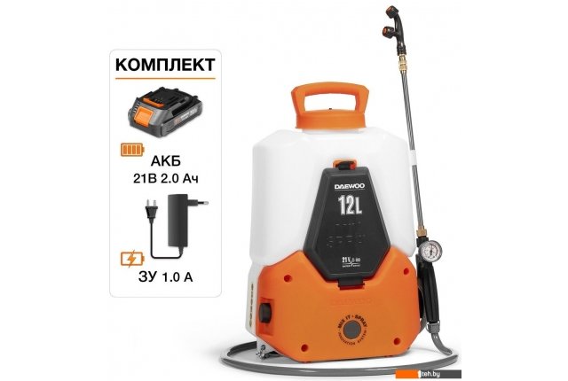 | Комплектация | - Опрыскиватель, - Зарядное устройство DAEWOO DACH 1021Li, - Аккумулятор DAEWOO DABT 2021Li, - Телескопическая штанга, - 6 насадок-распылителя, - Мерный стаканчик, - Фильтр на заливной горловине, - Ранцевый ремень, - Инструкция по эксплуатации, - Гарантийный талон. |
