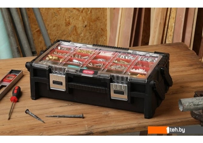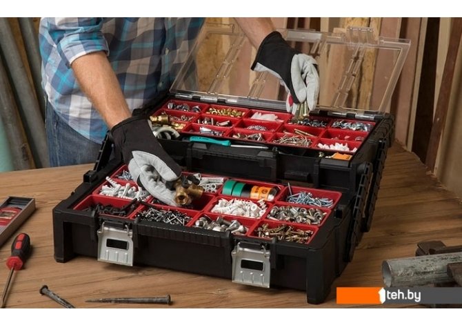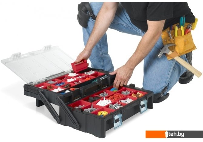 Информация | Ящик из прочного полипропилена с двумя раздвижными органайзерами и съемными модулями для хранения инструмента, мелких деталей, фурнитуры и метизов.Нижний органайзер:в комплекте 8 съемных модулей 115х70 мм; 2 съемных модуля 225х65 ммВерхний органайзер:в комплекте 10 съемных модулей 85х50 мм; 2 съемных модуля 85х105 мм; дополнительное несъемное отделение 285х115 ммпрозрачная крышка для удобной визуализации содержимого отделений |
