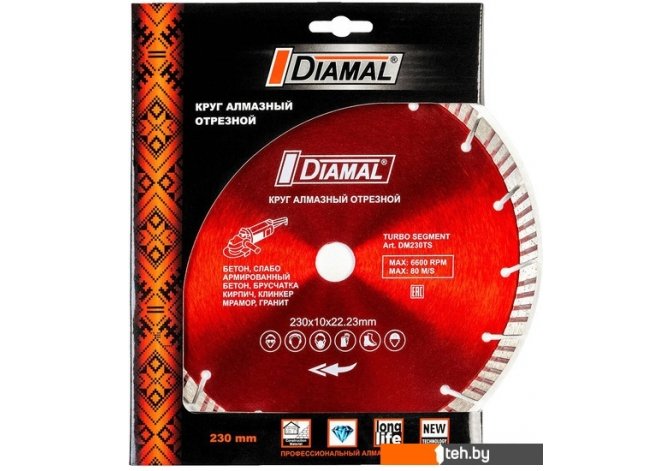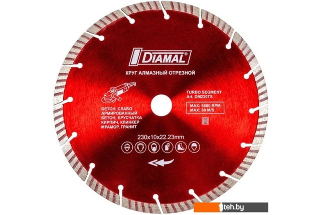 | Информация | Диск алмазный отрезной TURBO SEGMENT DIAMAL артикул DM230TS характеризуется хорошим соотношением цены и качества. Имеет высокую скорость резания и большой ресурс,что обеспечивает быструю и эффективную работу. DIAMAL диск алмазный отрезной артикул DM125TS показывает хорошие результаты при резки бетона, слабо армированного бетона, брусчатки, кирпича, клинкера мрамора, гранита на средних и высоких оборотах. Диск отлично себя зарекомендовал при резке цементно-стружечных плит УШМ и болгаркой. |