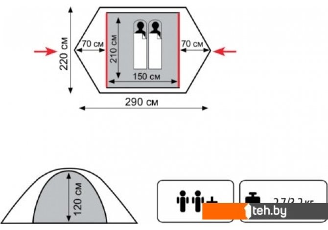 | Информация | - Двухслойная палатка с двумя входами- Вход спального отделения продублирован москитной сеткой- Увеличенный тамбур, два вентиляционных клапана, все швы проклеены- Идеальна для туристических походов в весеннее, летнее и осеннее время |
