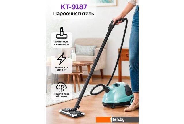 | Информация | Пароочиститель КТ-9187 способен заменить паровую швабру, дезинфектор, стеклоочиститель и отпариватель. При помощи него можно проводить уборки, не используя сильные чистящие средства. Работа с КТ-9187 не требует от пользователя особых навыков и умений. Кнопка «Вкл/Выкл» включает и выключает устройство. При включении пароочистителя начинается нагрев бойлера, загорается индикатор питания. Когда бойлер прогреется и пароочиститель будет готов к подаче пара, загорится индикатор готовности пара. Чтобы начать подачу пара, необходимо зажать кнопку подачи пара на паровом пистолете. Блокиратор фиксирует кнопку в нажатом или не нажатом положении. Зажмите кнопку подачи пара, сдвиньте блокиратор вправо. Теперь кнопка подачи пара зафиксирована. На корпусе пароочистителя есть ручка для переноски. Колёса позволяют с лёгкостью перемещать пароочиститель, не поднимая его. КТ-9187 предназначен для уборки полов и поверхностей, находящихся как внутри, так и вне помещений. Для эффективной очистки и дезинфекции в комплекте идут 7 насадок и 2 тряпочки. Длина шнура 3,7 м. Большое количество насадок в комплекте поможет очистить труднодоступные или сильнозагрязненные поверхности без использования химии. Мерный кувшин и воронка служат для удобного наливания воды в резервуар. Резервуар для воды съёмный и имеет объём 2,5 литра. Для удаления стойких загрязнений только силы струи пара может быть недостаточно. Используйте нейлоновую или стальную щётку для усиления механического воздействия. При уборке вы можете использовать моющие средства — горячий пар усиливает их воздействие. Длина шнура 3,7 м. Излишки шнура питания вы всегда можете намотать на держатель, который подсоединяется к обратной стороне прибора. |