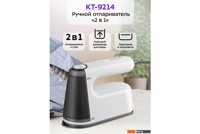 | Информация | - Ручной отпариватель «2 в 1» КТ-9214 предназначен для разглаживания изделий из текстиля с помощью горячего пара или при помощи нагреваемой рабочей поверхности. Устройство обладает такими достоинствами, как мощный поток пара, удобство при использовании. - Ручной отпариватель приведёт в порядок вещи быстро и практически в любом месте – без раскладывания гладильной доски. Одежда при этом может висеть на вешалке, сушилке для белье или верёвке. Устройство можно держать вертикально, под углом или горизонтально. - Ручной отпариватель – более функциональное и универсальное устройство, чем утюг. Волокна ткани приобретают объёмность, эластичность и блеск. Можно отпарить занавески и портьеры, обивку мягкой мебели, матрасы или мягкие игрушки. - Рабочая поверхность отпаривателя имеет тефлоновое покрытие. Отпариватель можно использовать в режиме сухой глажки, используя как обычный утюг. Температура нагрева рабочей поверхности составляет 180 °C. - Отпариватель оборудован съёмным резервуаром для воды ёмкостью 100 мл. Простым нажатием отсоедините ёмкость из основания и наполните водой, даже не отключая отпариватель от сети. Время подачи пара составляет 6–8 минут. - Чтобы отпариватель можно было поставить в перерывах при отпаривании и глажке или оставить остывать, в комплекте предусмотрена специальная подставка. |