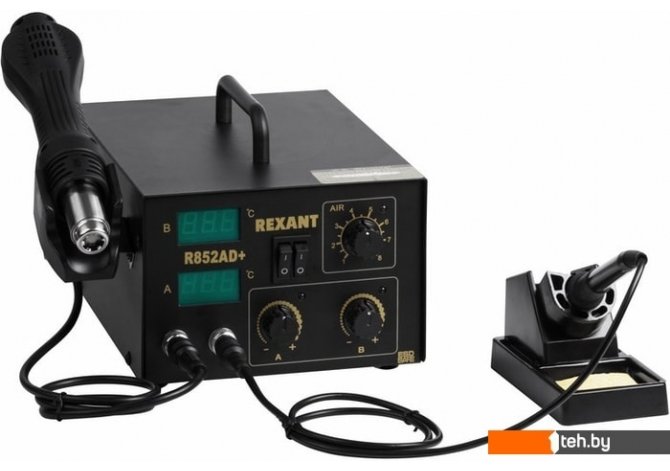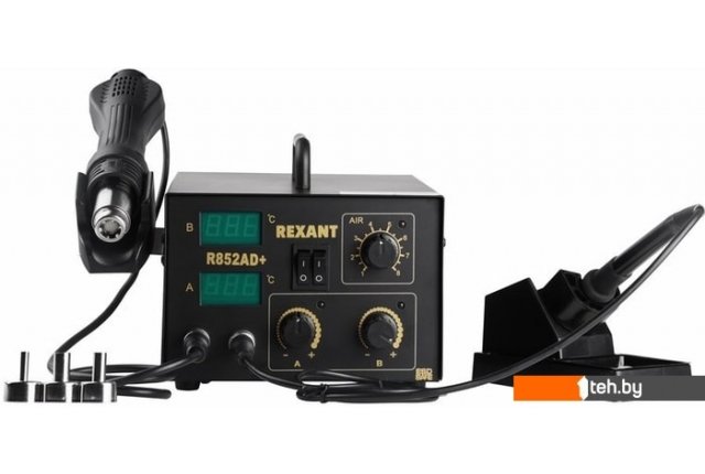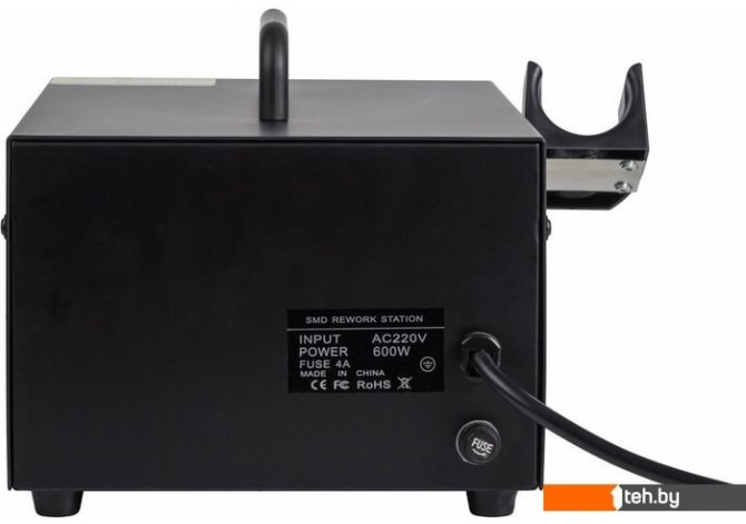 | Комплектация | основной блок, термофен, паяльник, держатель паяльника, держатель термофена, губка для очистки жала паяльника (в ложементе), 3 насадки для термофена разного размера. |
