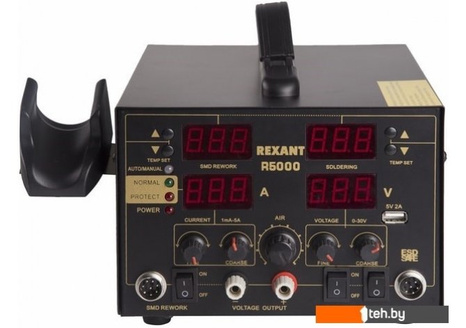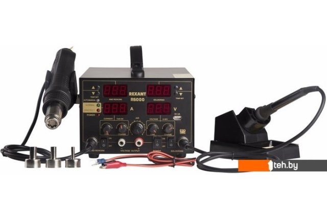 | Комплектация | основной блок, сетевой шнур, термофен, паяльник, держатель паяльника, держатель термофена, губка для очистки жала паяльника (в ложементе), 3 насадки для термофена разного размера, 1 пара проводов для БП. |