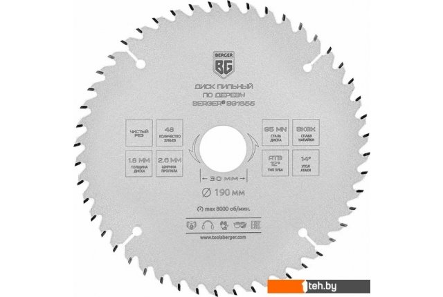 | Информация | ? Диск пильный по дереву и ДСП, чистый рез ? Сталь диска: 65Mn / 45-48 HRC ? Материал зубьев: твердый сплав ВК8Х / 89-90 HRC ? Тип зуба: ATB ? Угол скоса зуба: 12° ? Угол атаки зуба: 14° ?? — чистый рез ? — для быстрого поперечного и продольного распила мягкой и твёрдой древесины, ДСП, МДФ, ламината ? — для ручных и стационарных циркулярных пил |