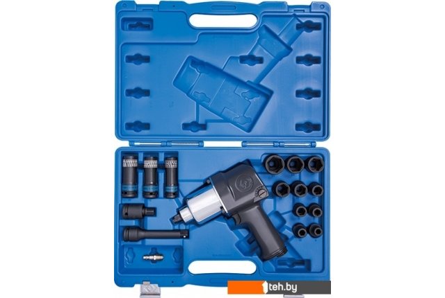 | Комплектация | – Гайковёрт пневматический ударный (арт. 33411-050) – Головки ударные короткие 9, 10, 11, 13, 14, 17, 19, 22, 24, 27 мм (серия 4535M) – Головки ударные глубокие тонкостенные 17, 19, 21 мм (серия 4415M) – Удлинитель ударный 125 мм (4260-05P) – Карда |