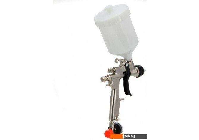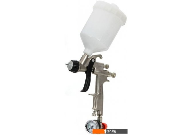 | Комплектация | - запасные части: набор прокладок, пружинок, стопорных колец, шток воздушного клапана - принадлежности: ключ универсальный, ёршик для чистки краскопульта, 3 фильтра для очистки ЛКМ, масло 15 мл для смазки трущихся частей и механизмов краскораспылителя, не соприкасающихся при работе с ЛКМ - редуктор — регулятор с манометром. - верхний бачок 0.68 л |