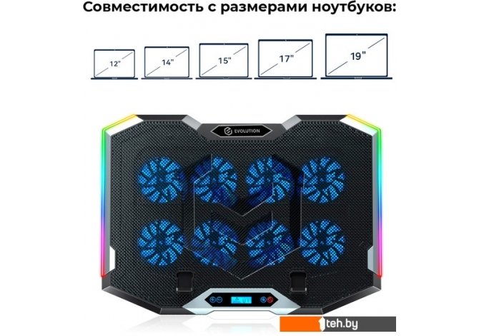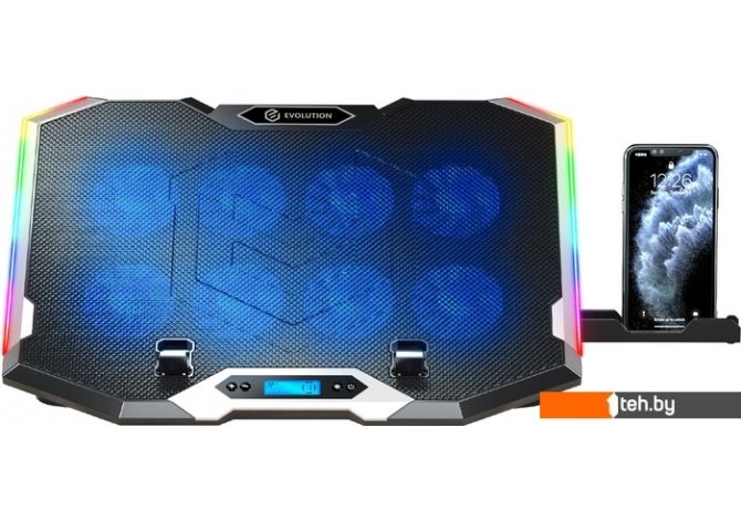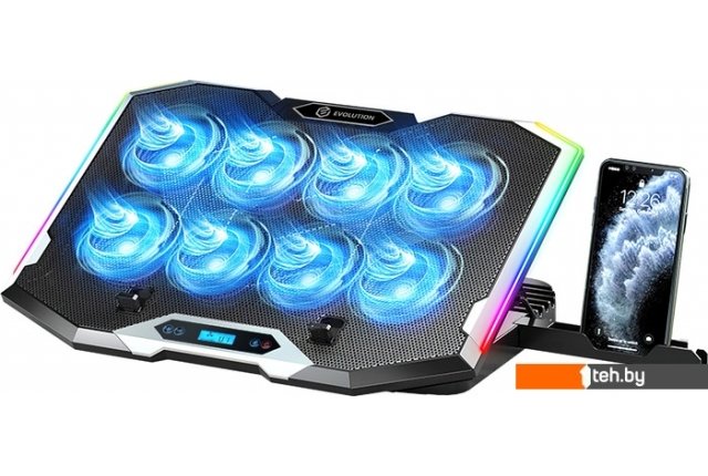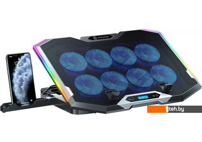 | Информация | ? Подставка Evolution LCS-07 RGB с 8 вентиляторами ? Имеет ЖК-дисплей ? 10 режимов RGB ? Подходит для ноутбуков до 19 дюймов ? Регулируемый угол наклона: 6 уровней ? Противоскользящие накладки для устойчивости и защиты от царапин ? В комплекте плетеный кабель длиной 70 см ? Есть держатель для мобильного телефона |