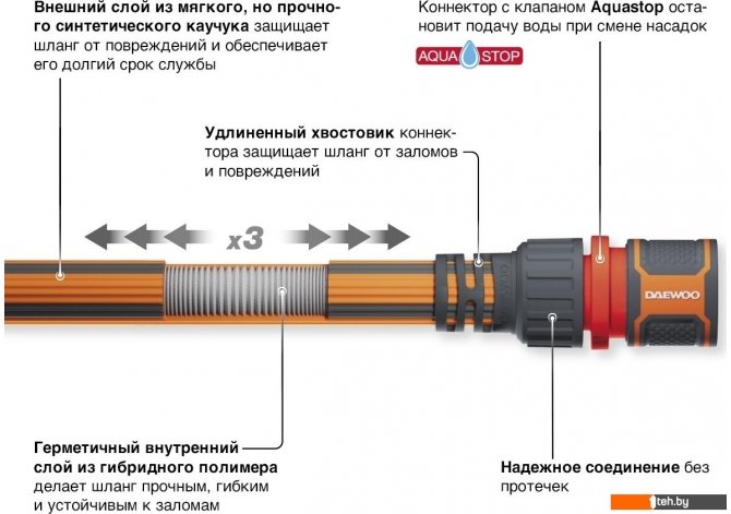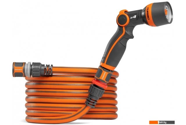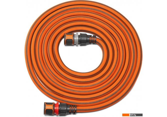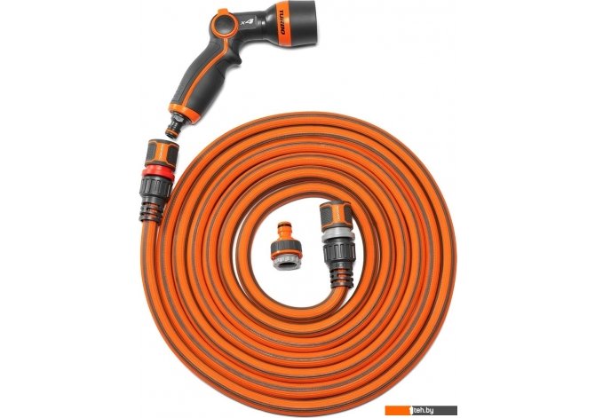 | Информация | - Увеличение длины до 3 раз Благодаря гофрированному внутреннему слою из гибридного полимера под воздействием давления воды шланг увеличивает длину до 3х раз. - Прочный верхний слой Тактильно приятный внешний слой из искусственного каучука защищает шланг от воздействия окружающей среды и позволяет ему легко скользить по любой поверхности. - Безопасный Материалы, из которых изготовлен шланг, не содержат токсичных фталатов и тяжелых металлов. - Полный комплект В комплекте поставки всё, что нужно для моментального подключения к водоснабжению. Шланг имеет быстросъёмные коннекторы, один из которых имеет запорный клапан Aquastop и 4-режимный пистолет DWG 1020 для решения любых задач в саду, а также адаптер для крана DWC 1019. |