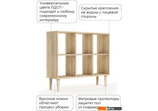 | Информация | Стеллаж наполнит ваше помещение полезным пространством и поможет организовать порядок в комнате. Напольный стеллаж на ножках можно использовать для игрушек, книг, обуви, цветов, пластинок. Попробуйте поставить его в прихожую, на балкон, в детскую, в гараж, в офис или салон красоты и увидите, как в интерьере добавится удобства и комфорта. Стеллаж на высоких ножках, выполненных из массива березы и покрытых лаком, делает композицию визуально легче и облегчает процесс уборки. Для большей устойчивости и надежности рекомендуется крепить стеллаж к стене с помощью прилагаемого стенного крепежа. Отличительной особенностью полок являются скрытые крепления, которых не видно с лицевой стороны. Вся фурнитура входит в комплект к изделию. |