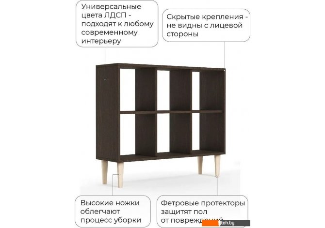 | Информация | Стеллаж наполнит ваше помещение полезным пространством и поможет организовать порядок в комнате. Напольный стеллаж на ножках можно использовать для игрушек, книг, обуви, цветов, пластинок. Попробуйте поставить его в прихожую, на балкон, в детскую, в гараж, в офис или салон красоты и увидите, как в интерьере добавится удобства и комфорта. Стеллаж на высоких ножках, выполненных из массива березы и покрытых лаком, делает композицию визуально легче и облегчает процесс уборки. Для большей устойчивости и надежности рекомендуется крепить стеллаж к стене с помощью прилагаемого стенного крепежа. Отличительной особенностью полок являются скрытые крепления, которых не видно с лицевой стороны. Вся фурнитура входит в комплект к изделию. |