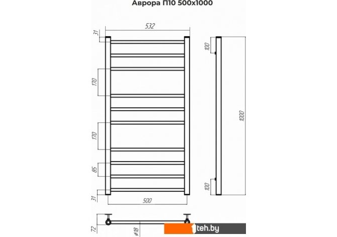| Информация | ? Тип полотенцесушителя: Водяной ? Подключение: нижнее ? Форма: Лесенка ? Количество перекладин: 10 ? Группировка: 4-3-3 ? Высота, мм: 1000 ? Ширина, мм: 532 ? Межосевое расстояние, мм: 500 ? Теплоотдача, Вт: 330 ? Рабочее давление: 3-15 Атмосфер ? Давление испытаний: 20 Атмосфер ? Комплектация: телескопические держатели к стене, кран Маевского, заглушка, паспорт изделия |