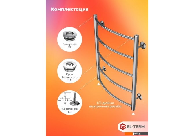 Если хотите купить полотенцесушитель El-term Грас П5 500x700 то следует уточнить все параметры и габариты модели перед покупкой. Представленые характеристики на сайте 1teh.by могут отличаться от действительных или указанных производителем. Описание, фото товара и технические характеристики представлены для справки.