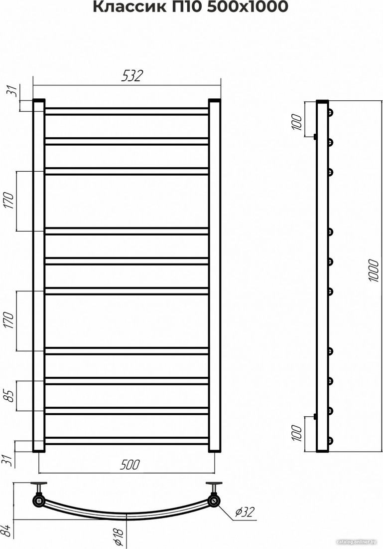 Информация | ? Полотенцесушитель TERMINUS Классик П10 500x1000 - водяной тип, с нижним подключением и формой лесенки. Имеет 10 перекладин, группировку 4-3-3 и высоту 1000 мм. Ширина составляет 532 мм, межосевое расстояние - 500 мм. Теплоотдача 330 Вт, рабочее давление 3-15 Атмосфер, давление испытаний 20 Атмосфер. В комплекте телескопические держатели к стене, кран Маевского, заглушка и паспорт изделия. |