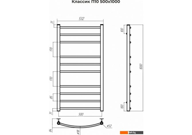 | Информация | ? Полотенцесушитель TERMINUS Классик П10 500x1000 - водяной тип, с нижним подключением и формой лесенки. Имеет 10 перекладин, группировку 4-3-3 и высоту 1000 мм. Ширина составляет 532 мм, межосевое расстояние - 500 мм. Теплоотдача 330 Вт, рабочее давление 3-15 Атмосфер, давление испытаний 20 Атмосфер. В комплекте телескопические держатели к стене, кран Маевского, заглушка и паспорт изделия. |