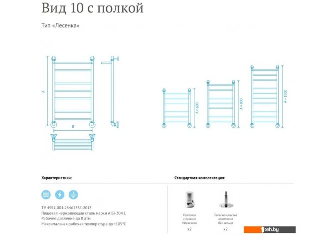 Если хотите купить полотенцесушитель Маргроид Вид 10 80x50 (с полкой, полимерное покрытие) то следует уточнить все параметры и габариты модели перед покупкой. Представленые характеристики на сайте 1teh.by могут отличаться от действительных или указанных производителем. Описание, фото товара и технические характеристики представлены для справки.