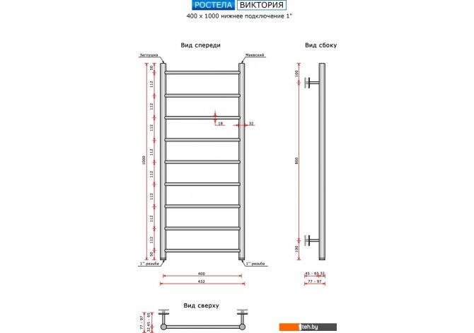 Фотографии, описание и технические характеристики модели полотенцесушителя Ростела Виктория 40x100/9 (1", нижнее подключение) взяты из открытых источников, официального сайта производителя или представительства Ростела в Республике Беларусь.