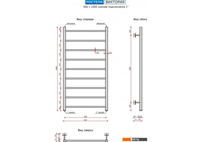 Фотографии, описание и технические характеристики модели полотенцесушителя Ростела Виктория 500x1000/9 1" (Ral 9016, нижнее подключение) взяты из открытых источников, официального сайта производителя или представительства Ростела в Республике Беларусь.