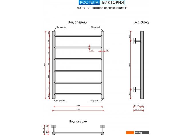 Фотографии, описание и технические характеристики модели полотенцесушителя Ростела Виктория 500x700/6 1" (Ral 9016, нижнее подключение) взяты из открытых источников, официального сайта производителя или представительства Ростела в Республике Беларусь.
