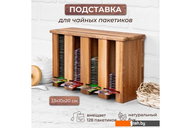 Информация | Подставка для чайных пакетиков 33х10,5х20 см выполнена из натурального дерева бука. Такой органайзер станет функциональным аксессуаром кухни и украшением интерьера. Коробка имеет 4 отделения для чая: можно по отдельности разместить несколько разных вкусов. Длина каждой секции 16 см. Коробочка - держатель поставляется в собранном виде. Емкости ящика для чая можно наполнить, открыв крышку. Крышка закреплена металлическими петлями. Изделие следует хранить при нормальном уровне влажности вдали от нагревательных приборов и без контакта с водой. Деревянный контейнер станет удобным помощником в сервировке стола и хранении чая в вашем доме. |