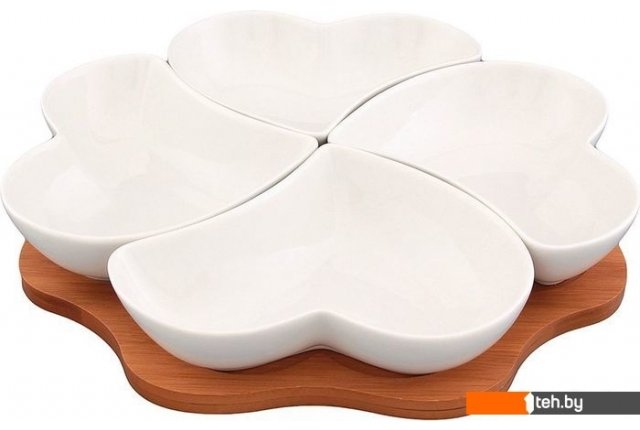 | Информация | Менажница «Сердце» состоит из 4-х секции в форме сердец и деревянной подставки. Секции выполнены из высококачественного фарфора, а подставка из натурального бамбука. Секции легко снимаются, а вместе составляют изящный цветок. Менажница идеально подходит для сервировки закусок, орешков, оливок, сладостей и любых других продуктов. Также секции можно использовать по отдельности в качестве соусников или салатников. В серии фарфоровой посуды с использованием бамбука представлен широкий ассортимент товаров для сервировки стола, которые, несомненно, впишутся в любой интерьер благодаря лаконичному дизайну, натуральным материалам и высокой функциональности. Такому подарку будет рада любая хозяйка! |