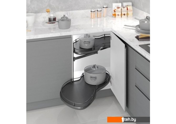 | Информация | Особенности: устанавливается в нижний угловой шкаф кухонного гарнитура; боковое левое/правое крепление; система Soft Closing, обеспечивающая плавное и тихое закрывание; полки регулируются по высоте и выдвигаются независимо друг от друга; максимальная нагрузка 40 кг (на каждую полку 20 кг); гальваническое покрытие; дно антискользящая поверхность. |