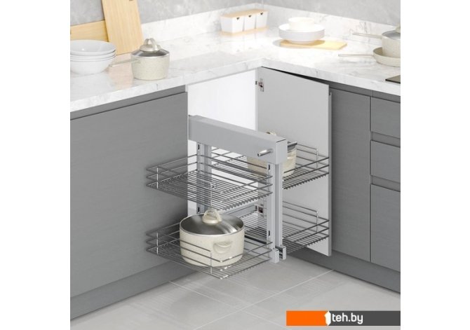 | Информация | Особенности: устанавливается в нижний угловой шкаф кухонного гарнитура; левое/правое крепление: к боковине корпуса, ко дну корпуса и фасаду; система Soft Closing, обеспечивающая плавное и тихое закрывание; трехмерная регулировка фасада; полки регулируются по высоте; максимальная нагрузка 35 кг (15 кг на две внешние корзины,20 кг на две внутренние корзины); гальваническое покрытие; дно корзин - ДСП. |