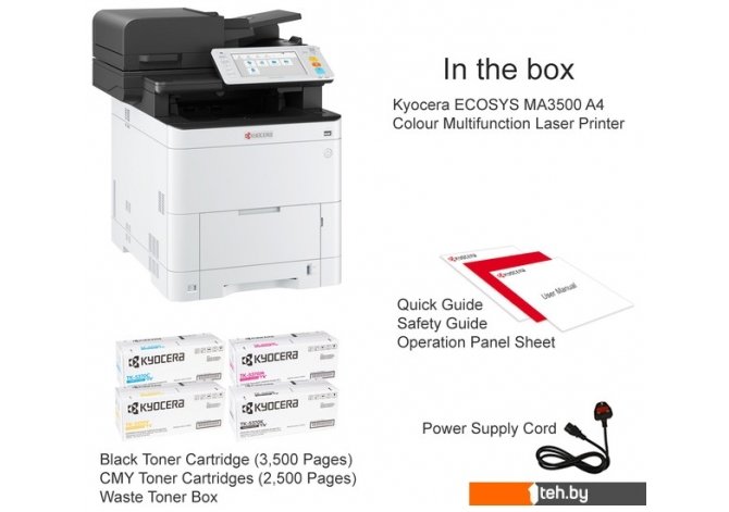 | Комплектация | Kyocera ECOSYS MA3500cix Стартовый черный картридж с тонером (3500 страниц) Стартовые цветные картриджи с тонером (2500 страниц) Ящик для отработанного тонера Краткое руководство Руководство по технике безопасности Лист панели управления Шнур питания |
