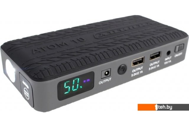 | Информация | ATOM 10 предназначен для запуска двигателей мотоциклов, легковых машин, генераторов и прочих устройств для питания которых используется 12В аккумуляторы. Мощности устройства хватит для запуска бензиновых двигателей объёмом до 4л и для запуска дизельных двигателей до 2.5л. С помощью АТОМ 10 можно заряжать и питать мобильные телефоны и планшеты, ноутбуки, энергоёмкое автомобильное оборудование (компрессоры, автохолодильники и т.д.). Мощный LED-фонарь поможет осветить место работы в течение нескольких суток. Режим мигания фонаря "SOS" поможет подать сигнал бедствия или предупредит других участников движения в случае неисправности фар. Благодаря малому весу и компактным габаритам ATOM 10 можно использовать в походе, в командировке или на рыбалке. В комплекте поставки:- интеллектуальный кабель для пуска автомобиля (длинна кабеля 200мм(красный) и 350мм(чёрный), сечение 7.5мм2)- сетевой адаптер 15В, 1A для зарядки устройства - кабель для зарядки от прикуривателя автомобиля,- кабель и набор переходников 8в1 для зарядки ноутбуков 19В, 3.5А- USB кабель 4в1 |