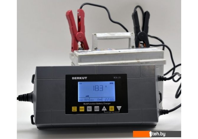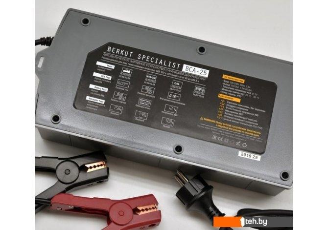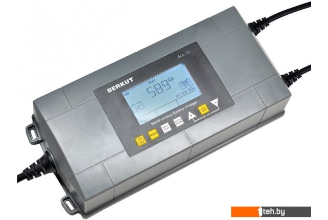 | Информация | Зарядное устройство BERKUT BCA-25 — полностью автоматическое устройство, предназначенное для диагностики, зарядки, ухода и технического обслуживания всех типов свинцово-кислотных аккумуляторных батарей (Сa/Ca, MF, AGM, VRLA, GEL) с напряжением бортовой сети 12V и 24V.Теперь пользователь может запустить все процессы диагностики как перед началом зарядки, так и по ее окончании и получить полную картину о состоянии своей АКБ — устройство снабжено многофункциональным ЖК-дисплеем, по которому можно оценить состояние батареи, уровень заряда и пусковых характеристик, а также замерить напряжение от генератора.BERKUT BCA-25 может работать в следующих режимах зарядки на выбор: режим «АВТО», «зимняя зарядка»/режим AGM, режим для кальциевых АКБ(Сa/Ca), а также в режиме «Источник питания».Устройство имеет поэтапный алгоритм работы, безопасно для любого электронного оборудования транспортных средств, имеет высокий уровень защиты от скачков напряжения в электросети и выполнено в надежном влагозащищенном и ударопрочном корпусе. |