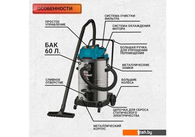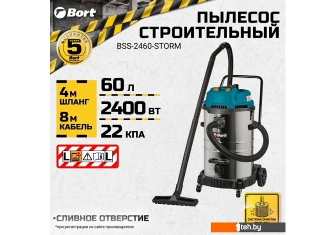 | Информация | - Пылесос для сухой и влажной уборки BORT BSS-2460-STORM - это высокопроизводительное устройство, которое обеспечивает эффективную очистку поверхности от пыли и грязи. Он оснащен двумя байпасными моторами, каждый из которых имеет мощность 1200Вт, что позволяет достичь максимальной производительности, объема всасываемого воздуха и эффективности уборки. - Одной из важных особенностей этого пылесоса является его очень большой бак объемом 60 литров. Это означает, что вы сможете осуществлять длительные сеансы уборки, не беспокоясь о частой замене мешков или опустошении контейнера для сбора мусора. Кроме того, наличие сливного отверстия упрощает процесс слива бака с грязной водой. - Длинный шланг 4 метра и длинный кабель 8 метров позволяют удобно перемещаться и осуществлять уборку в любых уголках комнаты без необходимости постоянного переключения розеток. Также, эта модель пылесоса имеет суммарную мощность 2400Вт, что обеспечивает высокую производительность и эффективность в работе при силе всасывания 22 кПа. - Очень важным параметром для оценки эффективности пылесоса является его расход воздуха, который в данной модели составляет 205 литров в секунду. Это говорит о том, что пылесос BORT BSS-2460-STORM обладает высокой мощностью и скоростью всасывания и может справляться с самыми большими объемами мусора. - Класс пыли L гарантирует эффективное удаление пыли и мелких частиц, поэтому этот пылесос идеально подходит для работы на стройке или в качестве системы аспирации в мастерской. - Благодаря полуавтоматической очистке фильтра, вы сможете поддерживать высокую производительность пылесоса без необходимости постоянной замены и чистки фильтра. - Металлические защелки бака обеспечивают надежное закрепление и предотвращают его случайное раскрытие во время работы. Это очень важный аспект безопасности и гарантированно предотвращает возможные неприятности и непредвиденные ситуации. Пылесос оснащен антистатической цепочкой, что делает его безопасным и надежным в использовании. - Пылесос BORT BSS-2460-STORM представляет собой идеальное решение для профессионалов. Его высокая производительность, широкий функционал и удобство в использовании позволяют сэкономить время и усилия при уборке больших площадей. Воспользуйтесь этим мощным и надежным пылесосом, чтобы ваше помещение всегда было идеально чистым и гигиеничным. |