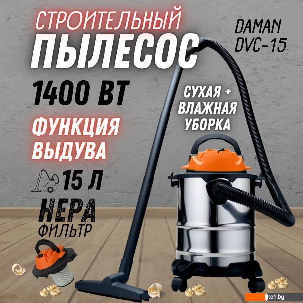 Информация | - Пылесос Daman DVC-15 предназначен для уборки в помещениях: сбора древесной стружки и опилок, пыли, легких фракций строительного мусора, образовавшегося при работе ручных и электрических машин (сухая уборка) и сбора воды с поверхности пола. |