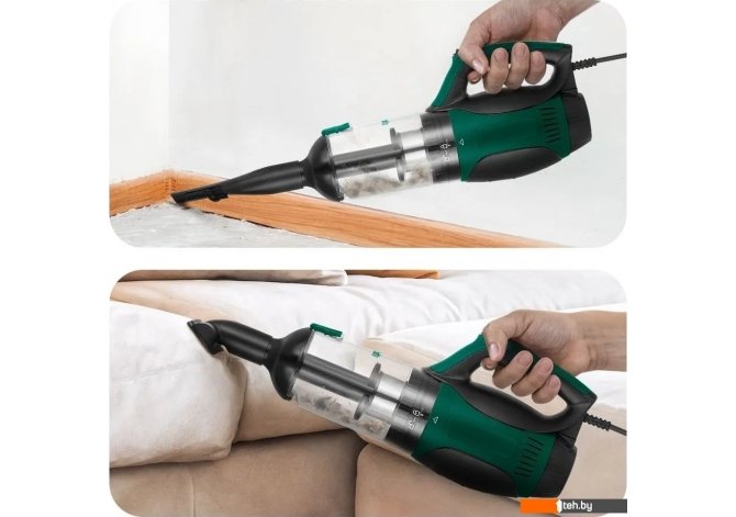| Информация | - Держу дом в чистоте! Вертикальный пылесос КТ-5315 очень удобен при локальной уборке. При отсоединении телескопической трубки и установке насадки он превращается в ручной пылесос. Пылесос оснащён манёвренной напольной щёткой, которая вращается в двух плоскостях. - Доберусь до всего Конструкция «2 в 1» предусматривает наличие ручного пылесоса. Ручным пылесосом можно пропылесосить места, куда обычным пылесосом очень трудно дотянуться из-за ограниченной длины шланга, а насадки из комплекта сделают уборку ещё более продуктивной! - Простое управление Управление пылесосом осуществляется за счёт всего одной кнопки рядом с ручкой. Переключатель включает и выключает пылесос. Помимо этого, вы можете регулировать длину трубки с помощью фиксатора на самой трубке. - Многоуровневая система фильтрации Пылесос оборудован современным циклонным фильтром, обеспечивающим хорошую очистку. Мелкие частицы, которые не захватываются потоком циклонного фильтра, удерживаются фильтром грубой очистки. Контейнер пылесборника полностью съёмный и имеет ёмкость 0,5 л. - |