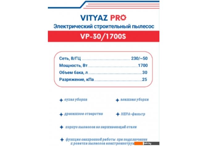 Если хотите купить пылесос Vityaz Pro VP30-1700S то следует уточнить все параметры и габариты модели перед покупкой. Представленые характеристики на сайте 1teh.by могут отличаться от действительных или указанных производителем. Описание, фото товара и технические характеристики представлены для справки.