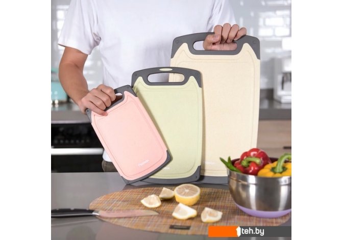 | Информация | Нарезка кубиками, соломкой или тонкими ломтиками? Нет ничего проще, чем на новых стильных и практичных разделочных досках FISSMAN. Доска сделана из прочного, безопасного для контакта с пищей пластика. Она устойчива к деформациям, не разбухает со временем от воды, не впитывает запахи, не тупит ножи, легко моется, проста и долговечна в использовании. Канавка по краям доски убережет от растекания влаги на стол (например при нарезании сочных фруктов или овощей), а благодаря силиконовым вставкам по краям доски она не будет скользить по поверхности стола, что обезопасит вас от возможных неудобств. За счет качественного и яркого исполнения она прекрасно впишется в любой кухонный интерьер. Можно мыть в посудомоечной машине. _x000D_ |